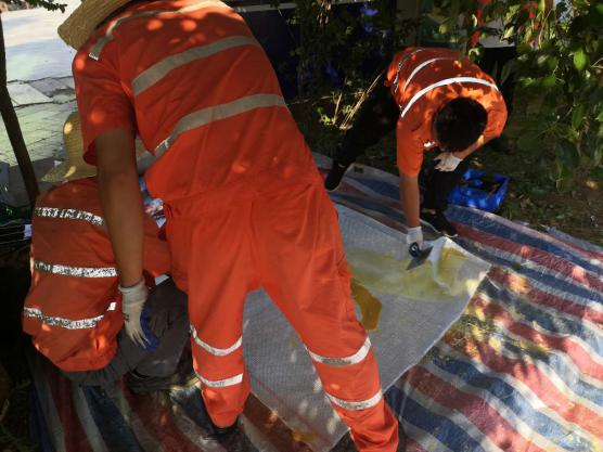 將兩種不同性質的、按照比例配置(黑白配比2:1)完成的樹脂,倒入攪拌桶內(nèi),用攪拌器充分攪拌至顏色均勻。將攪拌完成的樹脂,用刮刀在玻璃纖維布上均勻的刮抹。