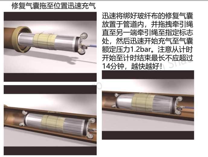 對于小管徑快速鎖施工,將攜帶專用修補氣囊定位到待修復部位,然后充氣使氣囊膨脹并將快速鎖撐開并緊貼管道修復部位,然后將氣囊泄壓取出,完成管道修復。